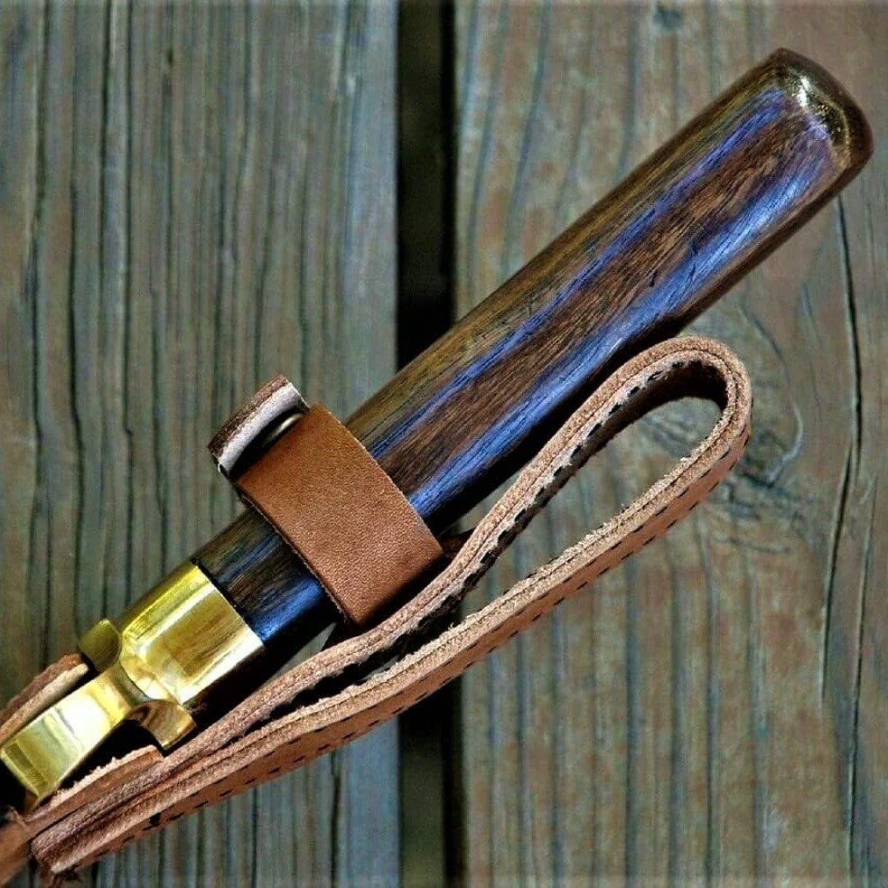 The handle features leather spacers, a brass guard, and a dark burl wood grip finished with a brass back nut cap, delivering a secure hold and authentic vintage aesthetic. Balanced construction makes it suitable for outdoor tasks and display collections.