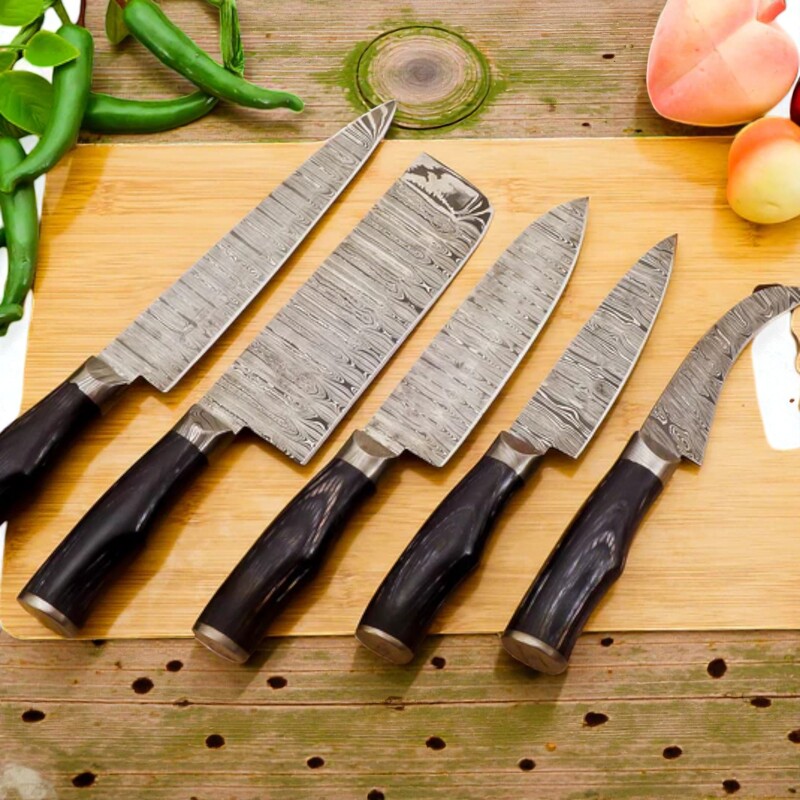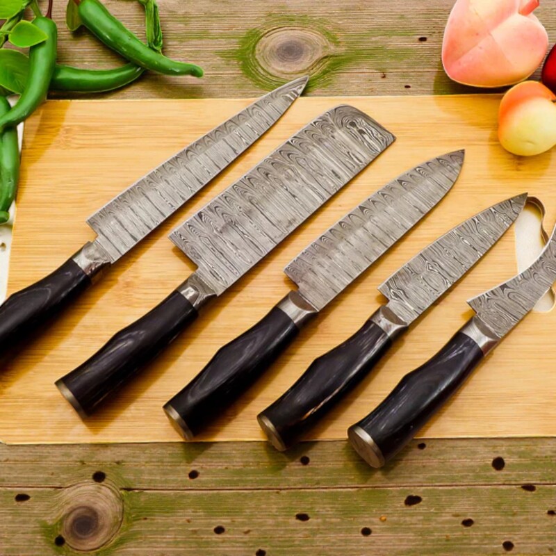 Upgrade your culinary kitchen with this 5-piece handmade Damascus chef knife set, crafted for professional chefs and passionate home cooks. Each blade is hand-forged with over 216 layers of 1095 & 15N20 carbon tool steel with nickel layer, heat-treated to 56–58 HRC for superior sharpness, edge retention, and durability.