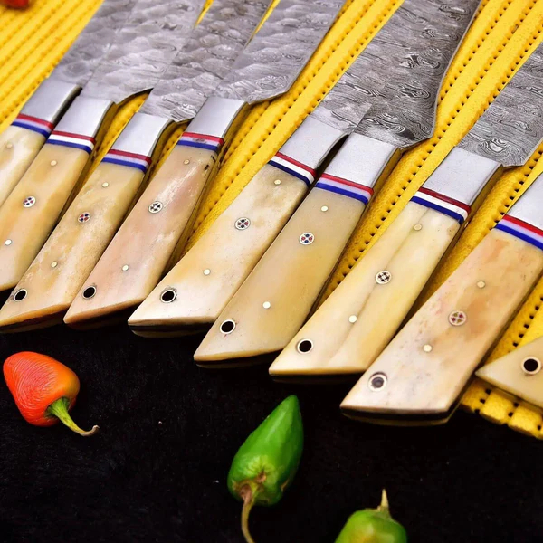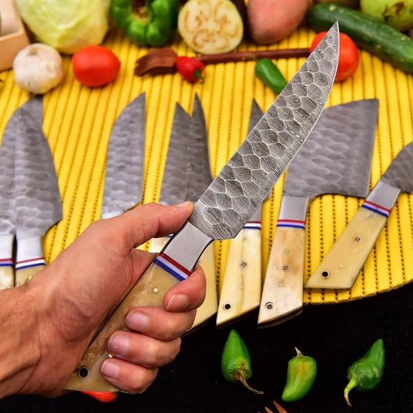 This versatile set includes essential knives for slicing, chopping, dicing, mincing, and precision tasks. Ergonomically shaped camel bone handles provide comfort, balance, and non-slip control, while full tang construction ensures strength and long-lasting durability.