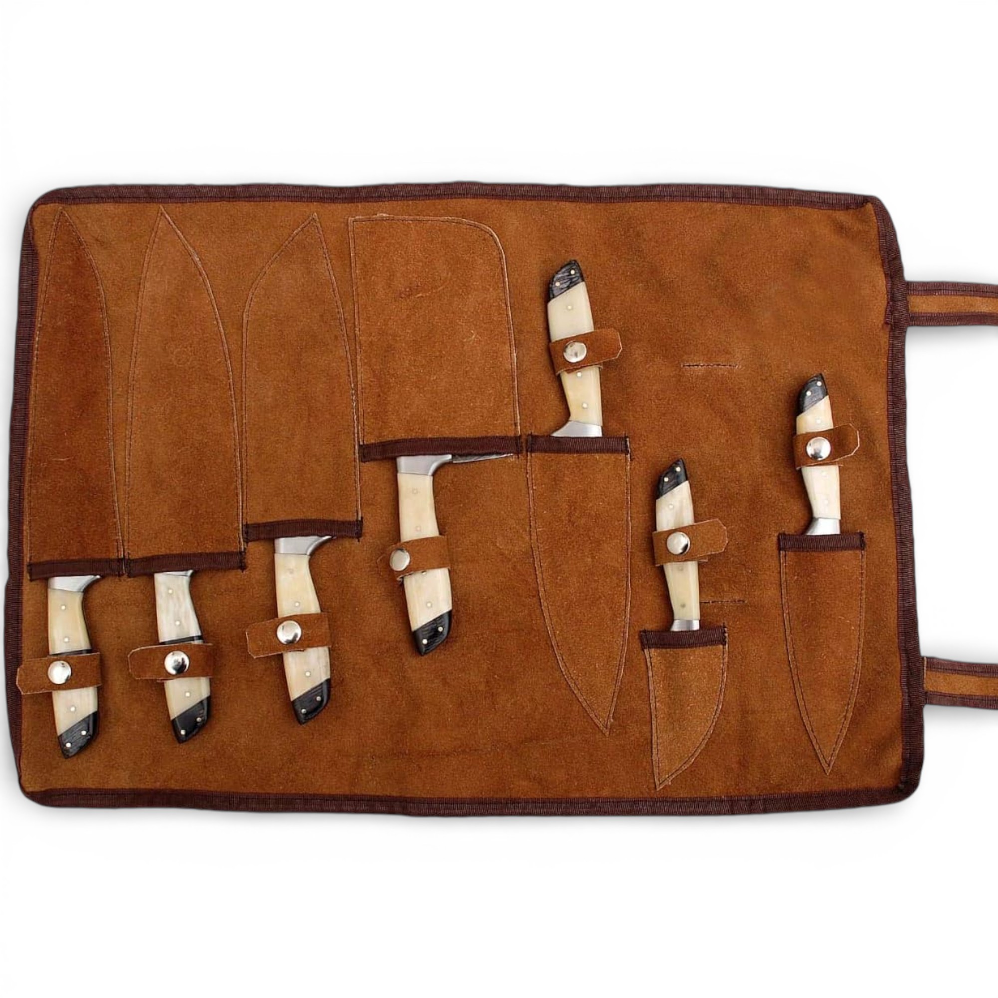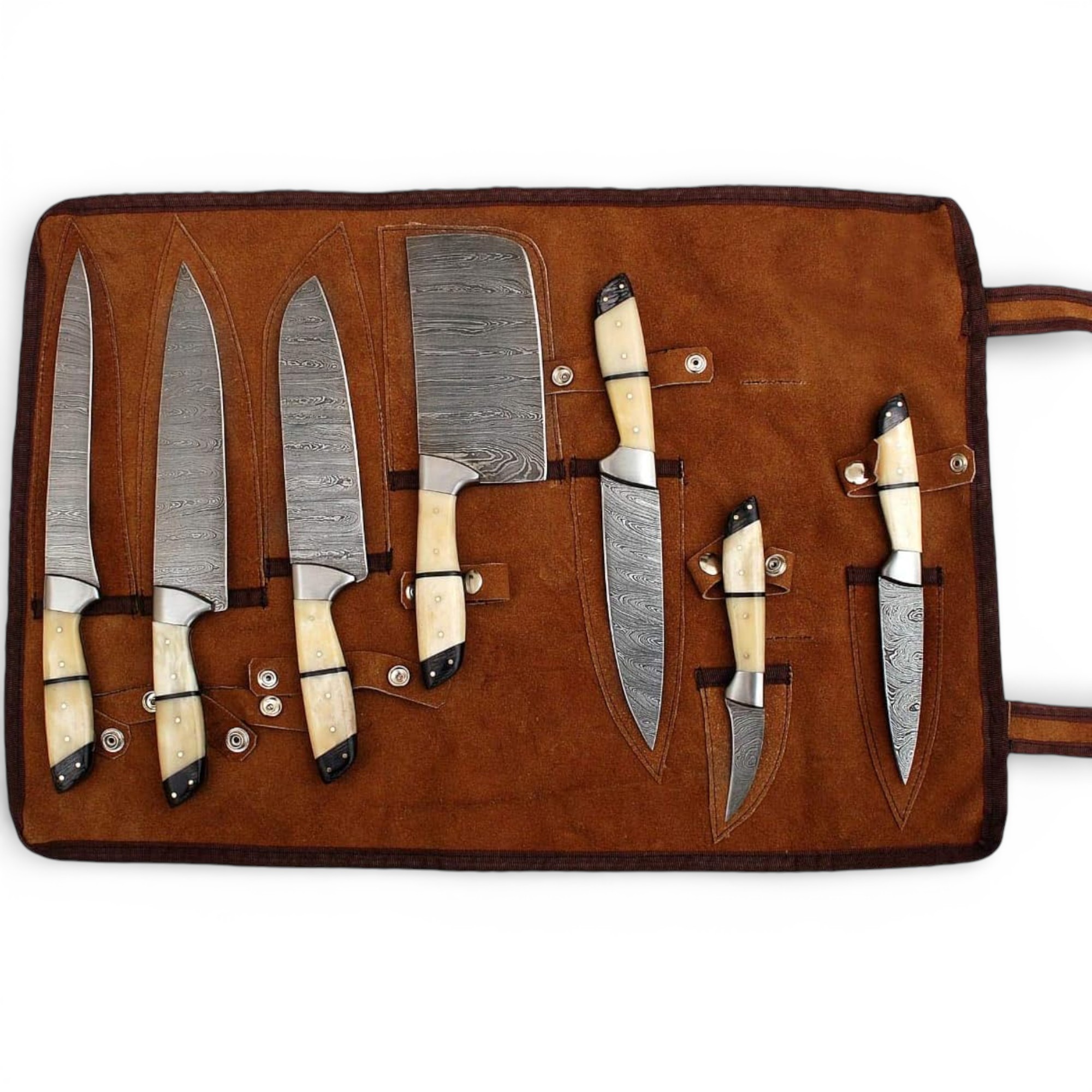 To maintain the quality of your knives, clean and dry them after each use and apply a light coat of oil to prevent rust. Avoid leaving the knives wet for extended periods and always store them safely in the leather roll bag to preserve sharpness and longevity. This knife set is perfect for chefs, culinary enthusiasts, and outdoor cooking professionals.