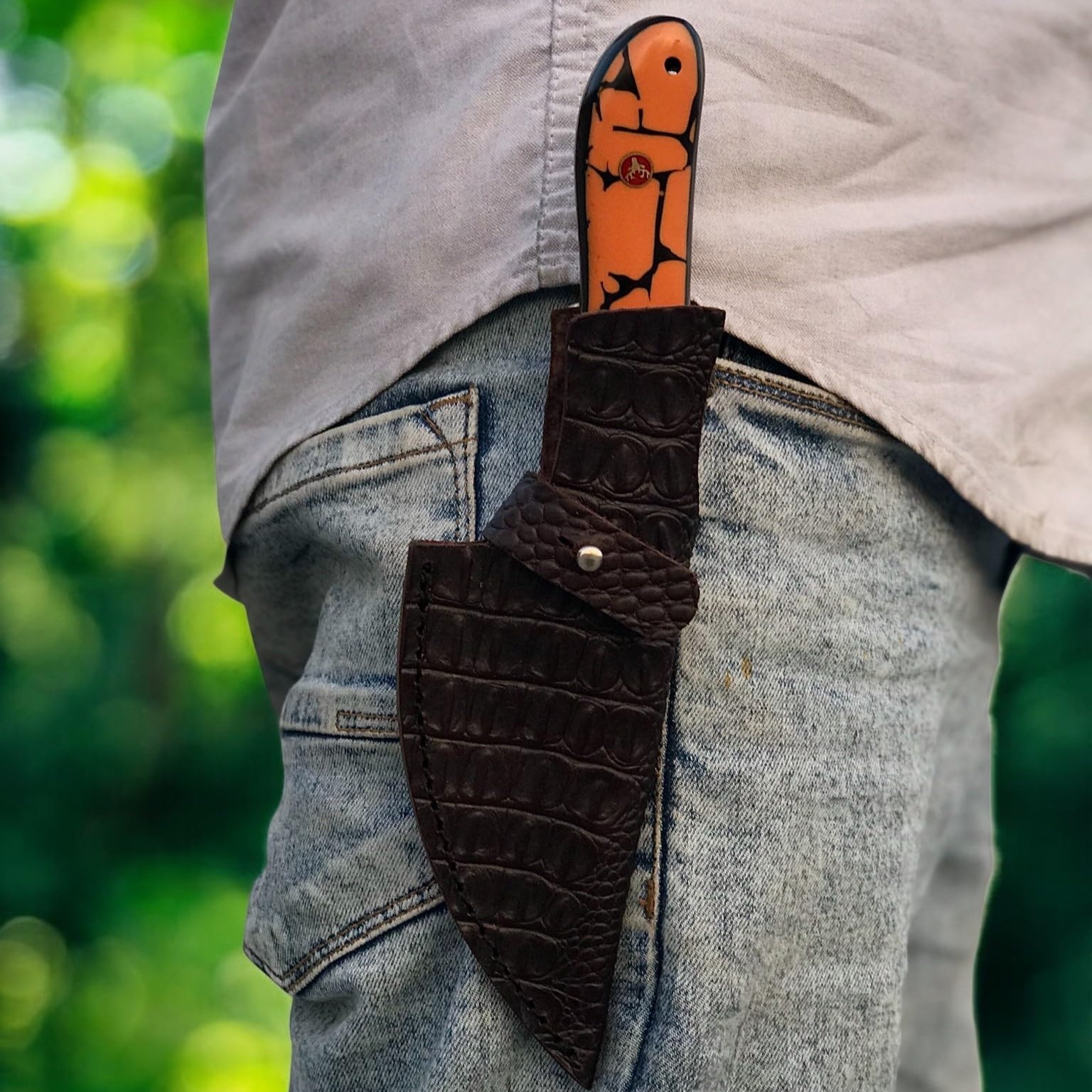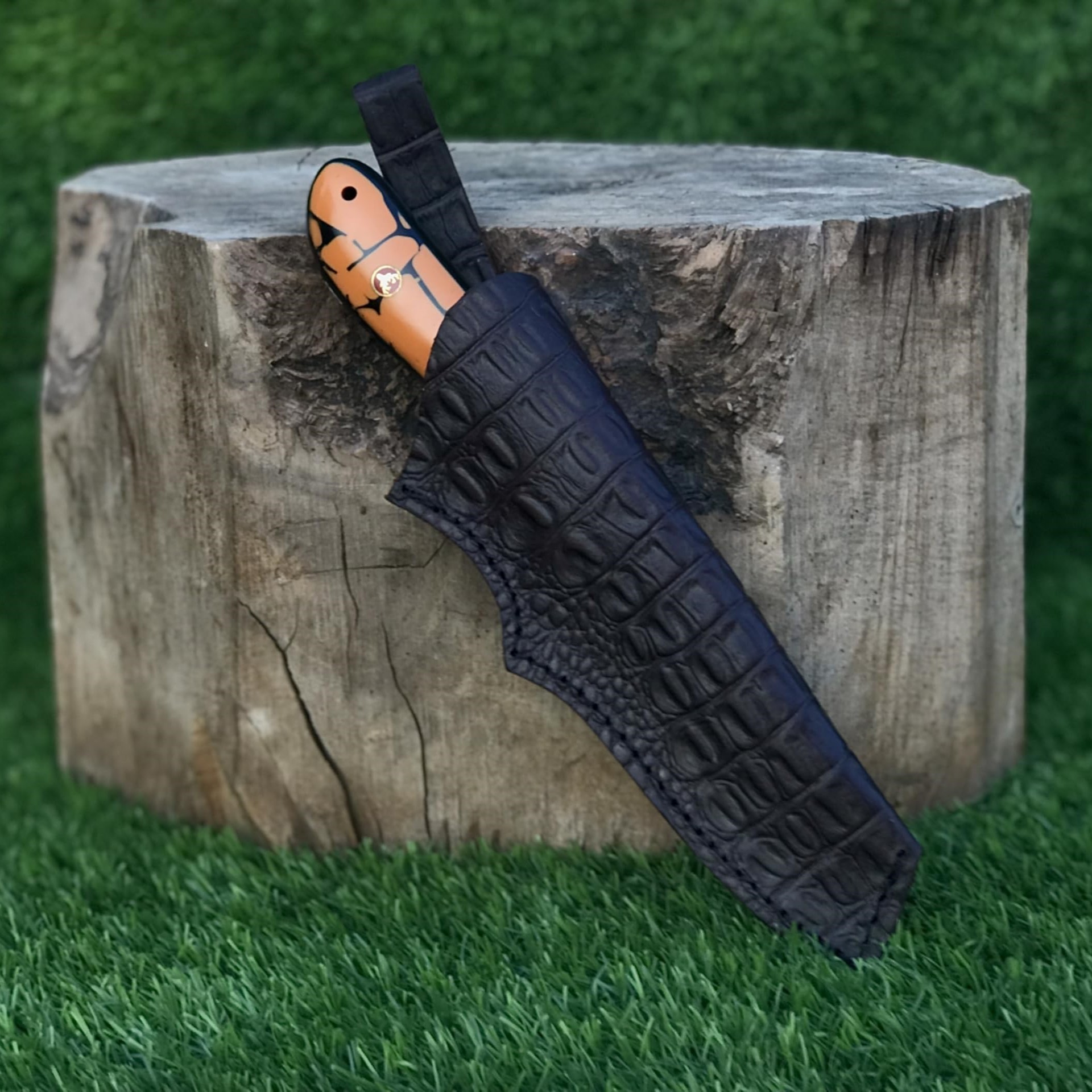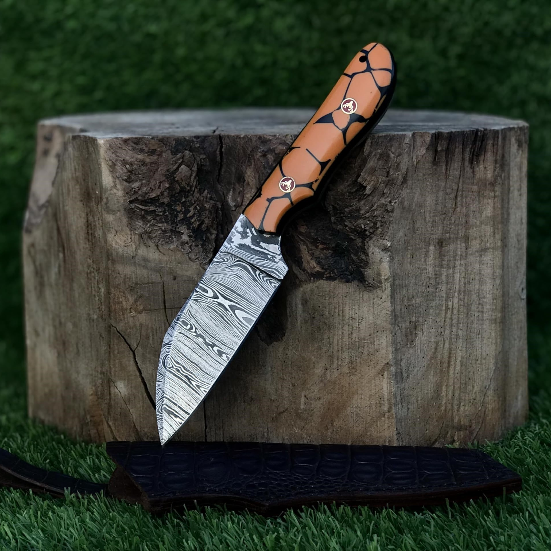 The 5” resin handle features stunning deer mosaic pins, providing both a comfortable grip and an eye-catching aesthetic. Each knife comes with a handcrafted crocodile leather sheath, ensuring safe carrying and a premium finish that reflects true craftsmanship.