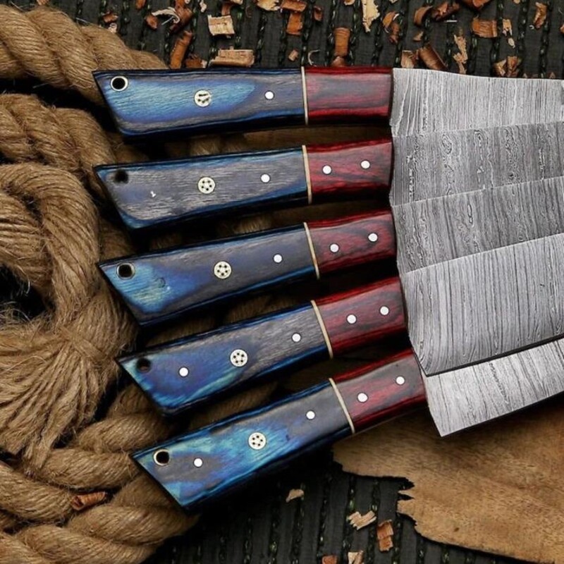 Upgrade your kitchen with this hand-forged 5-piece chef knife set, crafted from premium Damascus steel for professional chefs, home culinary enthusiasts, and kitchen aficionados. Each blade offers exceptional sharpness, edge retention, and durability, perfect for slicing, dicing, chopping, and carving.