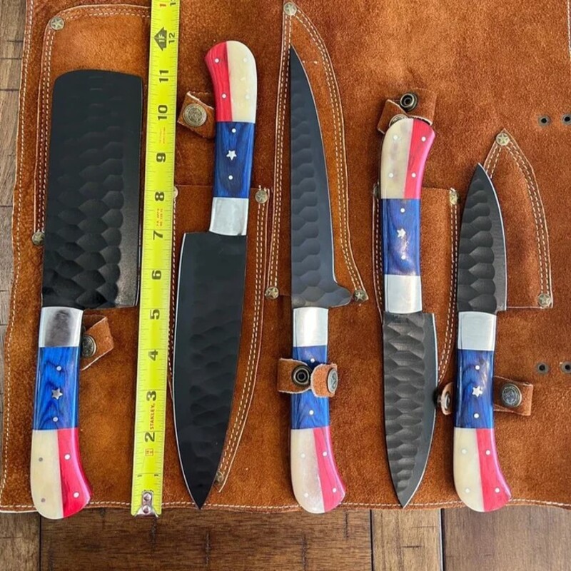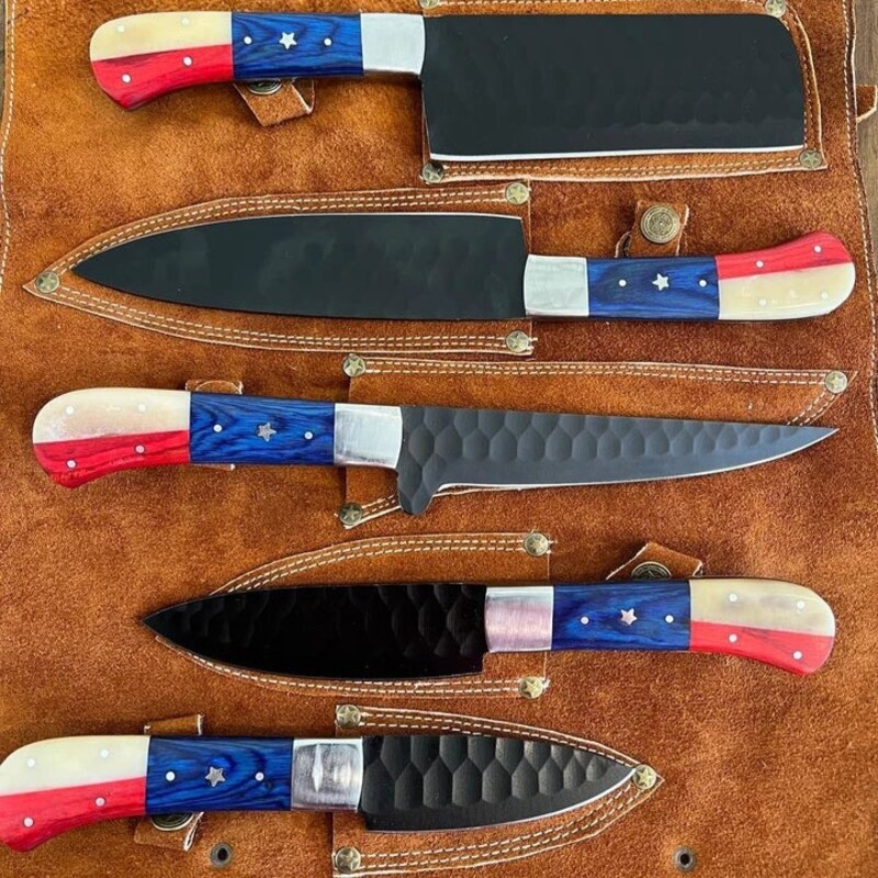 Bring a touch of bold artistry and professional performance into your kitchen with this hand-forged 5-piece chef knife set, inspired by the Texas flag. Crafted for chefs and home cooks who value precision, durability, and distinctive design, each knife is meticulously forged from premium D2 high-carbon steel for exceptional sharpness, edge retention, and long-lasting performance.