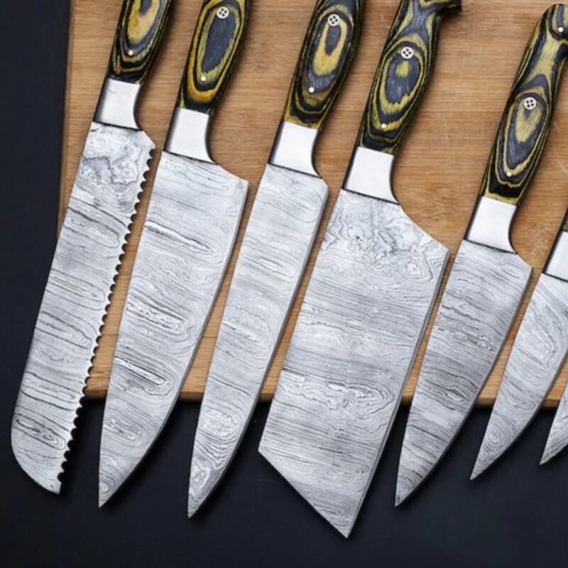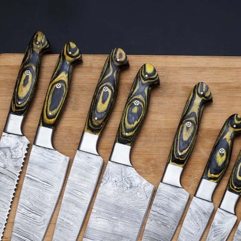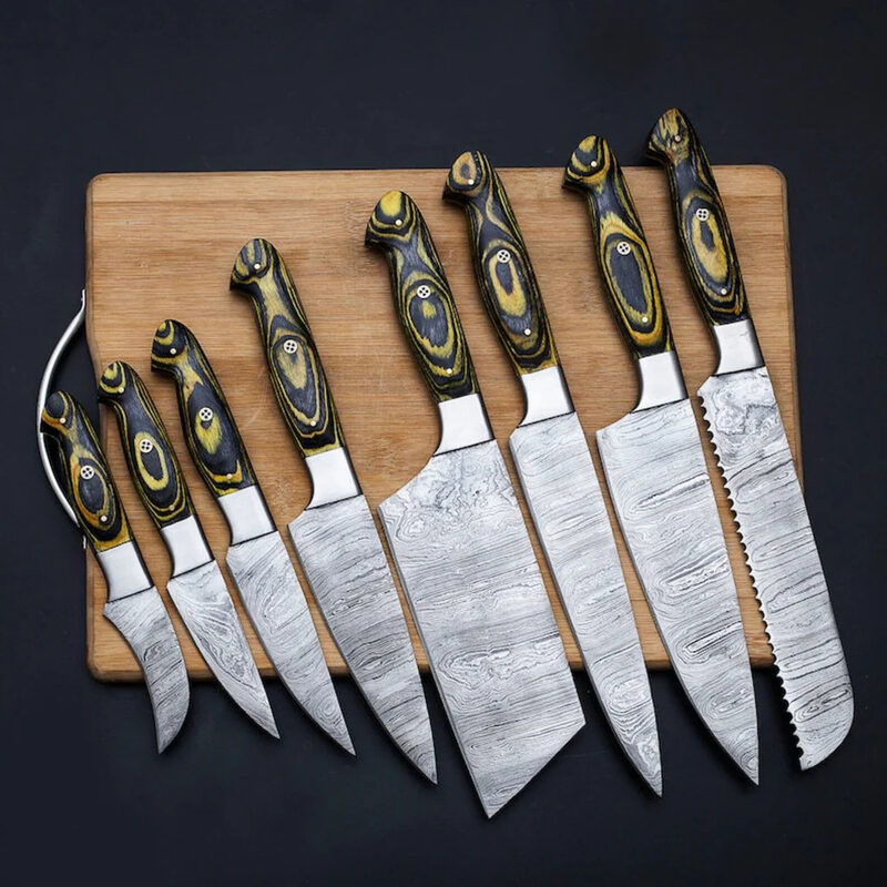 Upgrade your culinary experience with this handmade 8-piece Damascus kitchen knife set, designed for chefs and home cooking enthusiasts who demand precision and durability. Each knife is individually hand-forged from a premium blend of 1095 and 15N20 Damascus steel, delivering superior strength, sharpness, and long-lasting edge retention. The blades feature a precise twist pattern, adding both aesthetic beauty and functional performance for all cutting, chopping, and slicing tasks.