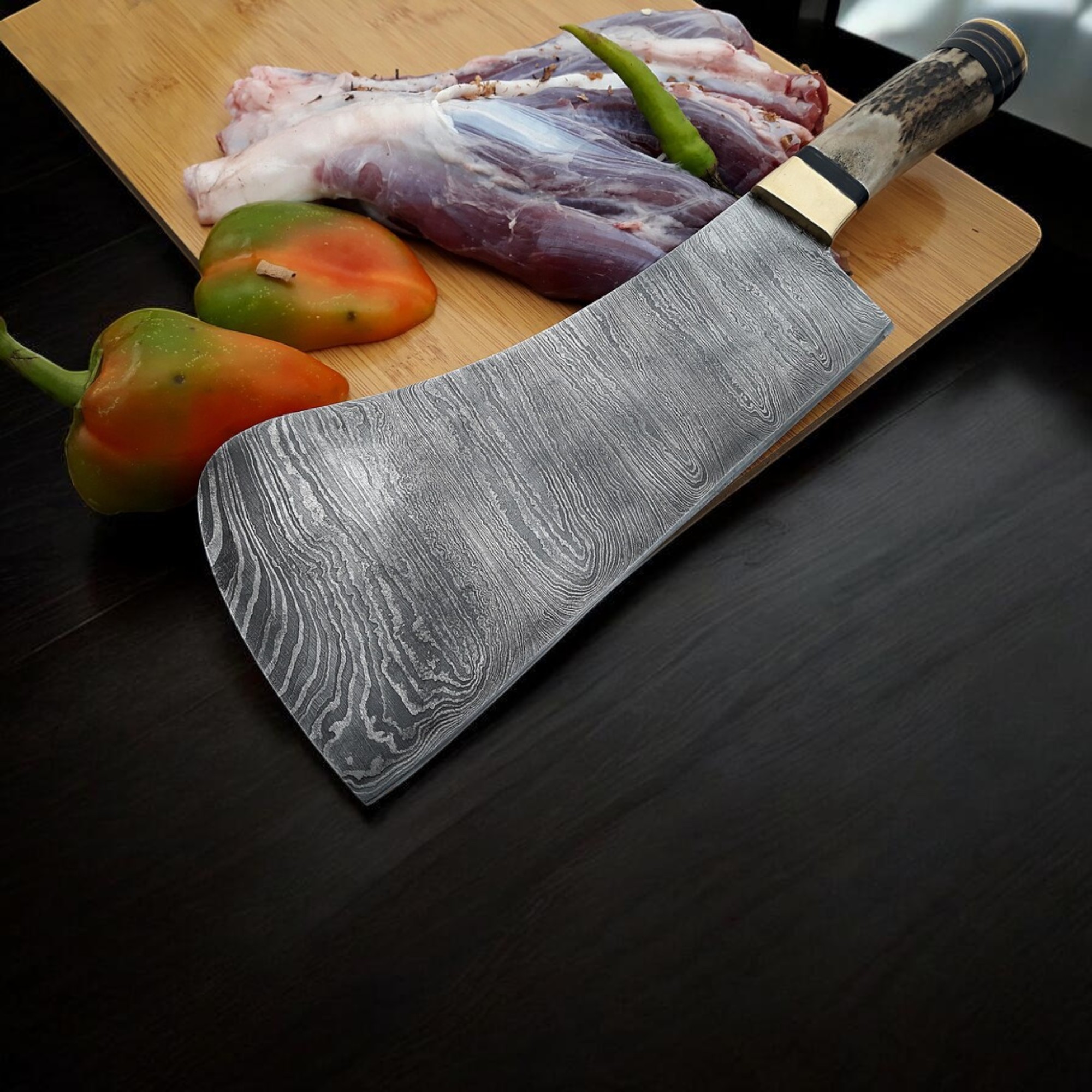 Upgrade your kitchen with this Premium Handmade Damascus Culinary Chef Knife Set, designed for professional chefs and passionate home cooks. This versatile kitchen set includes essential knives such as a chef knife, butcher knife, slicing knife, utility knife, and cleaver, making it ideal for chopping, slicing, dicing, and preparing a wide range of ingredients with precision.