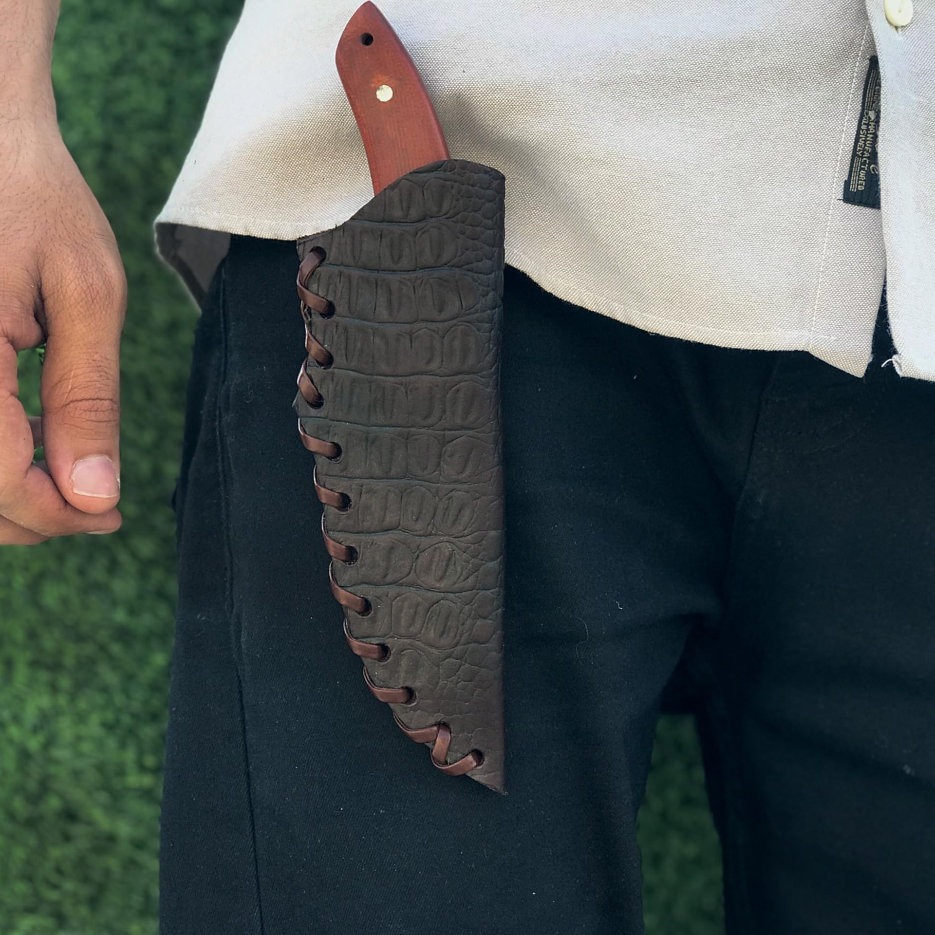 Includes handcrafted crocodile leather sheath for protection and style