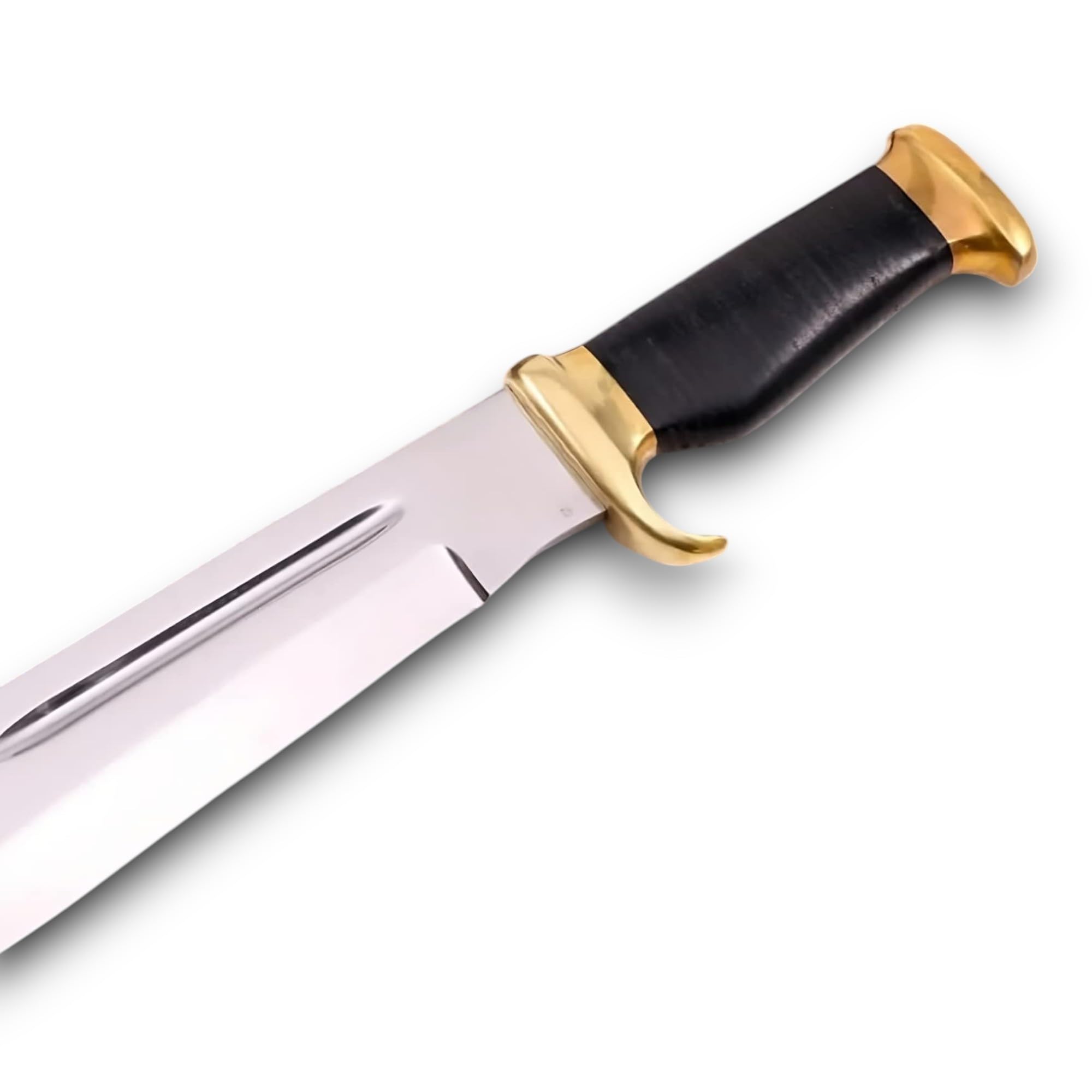 The handle is made from deep black dyed leather, offering a secure, comfortable grip with a bold and sleek look. Solid brass guard and pommel add strength, balance, and traditional Bowie character to the design.